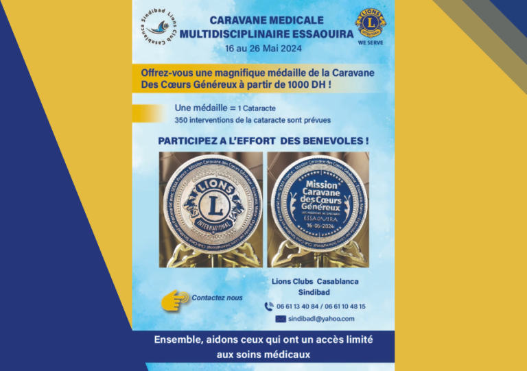 Une caravane médicale pluridisciplinaire en faveur des personnes démunies la population de la ville d’Essaouira et les environs du 16 au 26 mai 2024 organisée en collaboration par le Lions Club Casablanca et l’Association SEMA » Association Solidarité Maroc Amitié « qui organise sa 38ème caravane au Maroc et amène plus de 100 médecins, chirurgiens ,professionnels de la santé de France afin de soigner des personnes démunies de la région En étroite partenariat avec le Lions Club Essaouira Nouvelle Vague et les autorités de la Province et la ville.